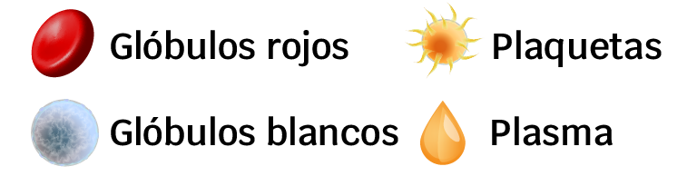 Los glóbulos rojos transportan oxígeno, los glóbulos blancos, son parte del sistema inmunitario, las plaquetas son esenciales para la coagulación y evitan las hemorragias excesivas, y el plasma se compone principalmente de agua con nutrientes y proteínas.